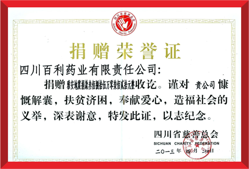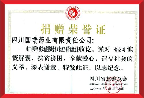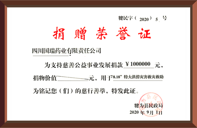 2020年8月18日,四川省犍为县遭遇百年未遇特大洪涝灾害,青岛绍辉食品检测与安全有限公司集团国瑞药业向犍为县灾区捐赠现金100万元。